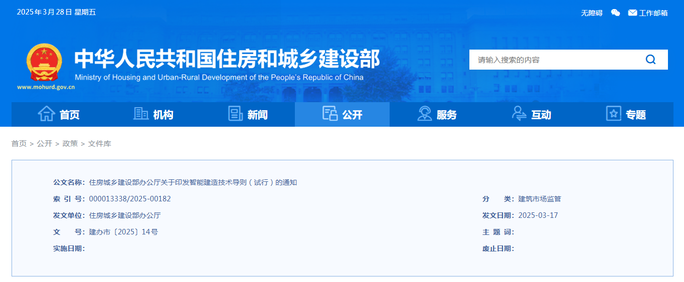 為貫徹落實《中共中央辦公廳、國務(wù)院辦公廳關(guān)于推進新型城市基礎(chǔ)設(shè)施建設(shè)打造韌性城市的意見》等文件要求,加快推進智能建造技術(shù)在工程建設(shè)全生命期應(yīng)用,推動建筑業(yè)高質(zhì)量發(fā)展,住房城鄉(xiāng)建設(shè)部組織編制了《智能建造技術(shù)導則(試行)》。現(xiàn)印發(fā)給你們,請結(jié)合實際參照執(zhí)行。